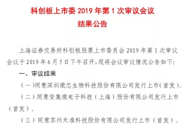 6月5日,科创板上市委召开第1次审议会议,审议深圳微芯生物科技股份有限公司、安集微电子科技(上海)股份有限公司、苏州天准科技股份有限公司等3家企业发行上市申请。最终三家全部过会!