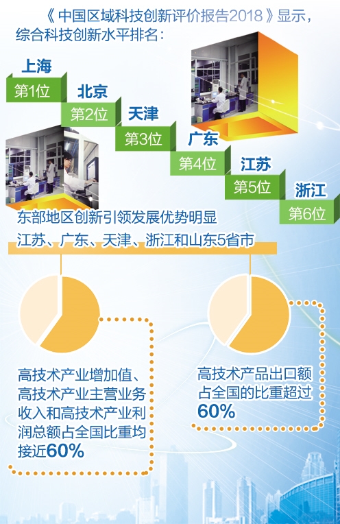 经过40多年改革开放,我国东部地区经济社会发展站上了新起点,区域发展步入了以科技创新为主导的新阶段。《中国区域科技创新评价报告2018》显示,我国区域创新水平稳步提升,其中上海、北京、天津、广东、江苏等东部省份位居全国前五,东部地区创新优势和引领发展的能力更加凸显。