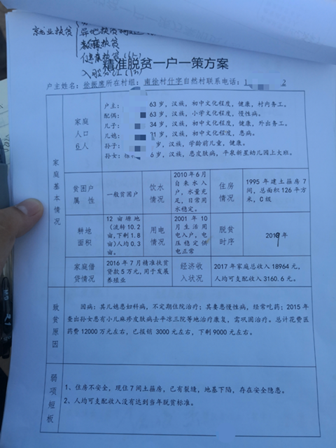 “其妻患慢性病,经常吃药;2015年查出孙女患有小儿麻疹皮肤病,需巩固治疗,总计花费医药费12000元……”在甘肃省庆阳市镇原县平泉镇村民徐振席家的墙上,挂着一本薄薄的“精准脱贫一户一策方案”,里面密密麻麻详细记录了他的家庭基本情况、致贫原因、弱项短板、扶贫措施以及由帮扶干部为他们家制定的脱贫路径和时间表。