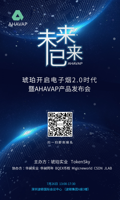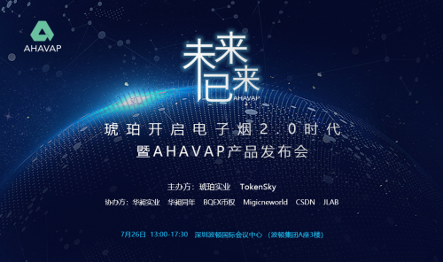 2019年7月26日,由琥珀实业、TokenSky联合主办,华昶实业、华昶同年、BQEX币权、Migicneworld、CSDN、JLAB鼎力协办的《未来已来 琥珀开启电子烟2.0时代》暨AHAvap产品发布会将在波顿科技园召开。会议围绕电子烟2.0以及电子烟+区块链,探讨大健康产业发展方向,推进电子烟链接新世界,并推动跨国、跨行业的深度合作。琥珀创始人,波顿华昶创始人,华昶同年总经理,TokenSky创始人,BQEX币权合伙人,JLAB创始人,上方股份董事长(中国程序员杂志之父、CSDN创始人、极客帮创始人),分布式协作组织研究院发起人,YottaChain创始人,深创学院创始人,链战发起人,BoolCapital创始合伙人等将出席会议。
