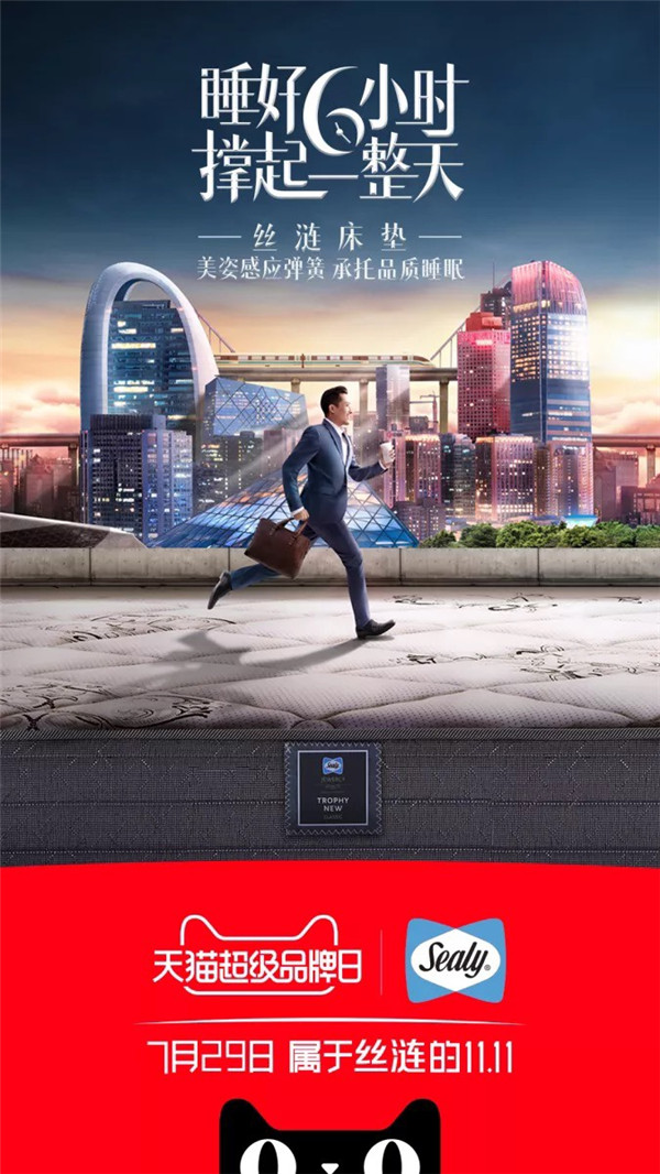 为给消费者带来一个无忧好睡眠,并帮助寝具品牌加深消费者对品牌了解,7月29日,天猫超级品牌日携手美国床垫品牌丝涟开启专场活动,以“睡好6小时,撑起一整天”为核心创意支撑,为消费者提供了百年弹簧专家定制专款、智能选床系统、100%货品进会场、部分爆款5折价格可抢购等专属的体验和服务。为消费者带来别具一格的“超级一天”,如果从睡眠改善和生活效能提升的结果来看,常规睡眠时间从8小时回调到6小时,这个超级一天即将有26小时那么长。