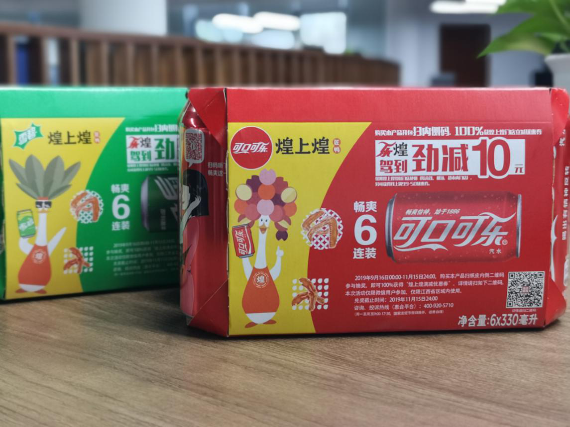 充分考虑到年轻消费群体的消费场景和购买场景,可口可乐和煌上煌定制“乐煌驾到”六连罐包装,并在江西省各大商超推出“乐煌驾到”定制包装特陈美陈全面入侵大众视野。