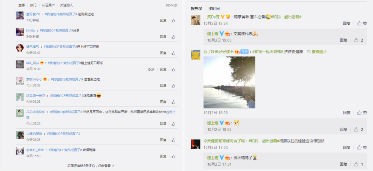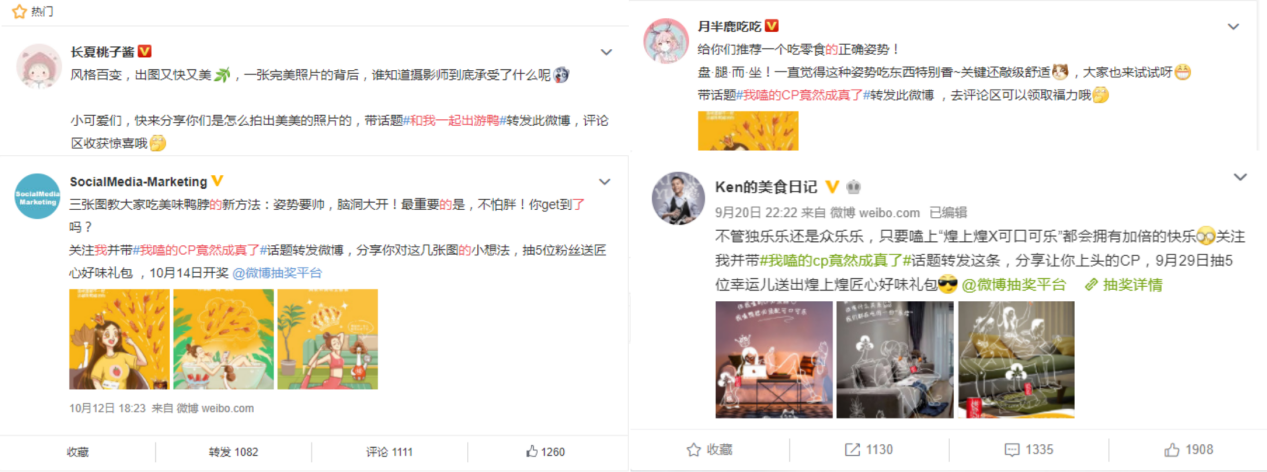 基于包装的定制,线下主题店的打造,及多元消费场景还原,煌上煌延续阵地推广,联合100+品牌共同围绕#我嗑的CP竟然成真了#以及#和我一起出游鸭#发声,进一步引发网友围观讨论,话题持续爆炒。