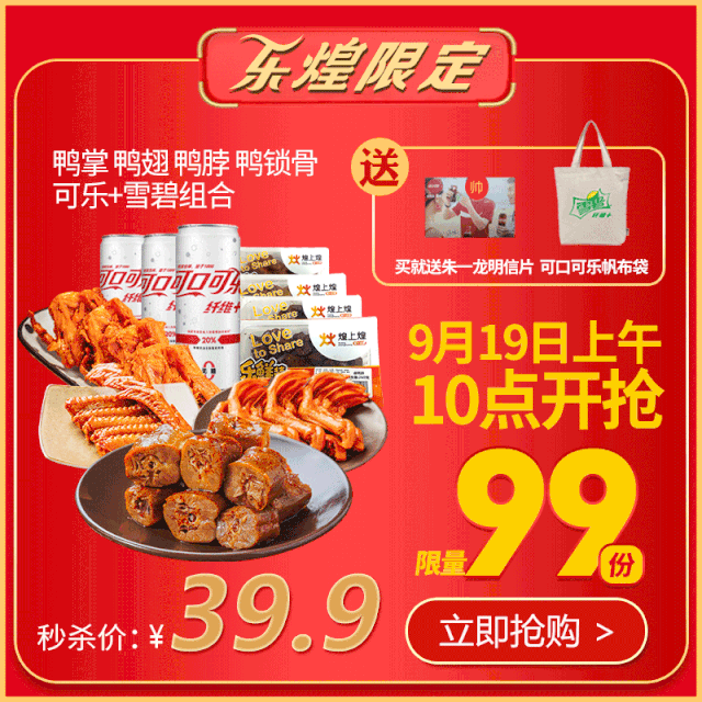 可口可乐和煌上煌也非常贴心,联合推出一元换购活动,请大家喝可乐,创造了江西全省1000余家门店三天总换购8000箱的纪录。同时,线下活动现场的完美气氛成功引燃线上传播。为了回馈线上粉丝,两大品牌推出乐煌限定套餐,并于2019年9月19日上午10点秒杀开抢。99份乐煌限定套餐一秒售罄,成绩斐然。