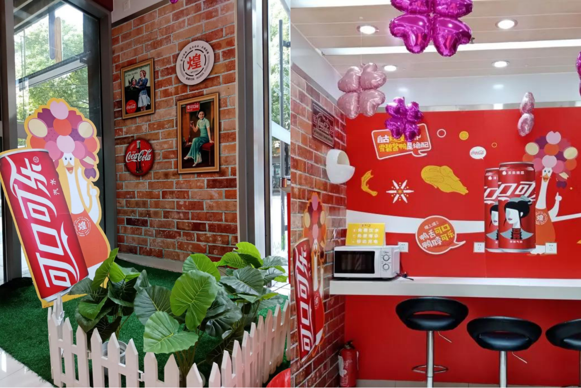 活动期间,为了更好地放大线下传播效果,煌上煌和可口可乐用极具体验感与沉浸感的物料联手打造线下『联名主题店』,复古美式风+可口可乐经典红,每个角落都让流行归根,满足了目标客户群体的猎奇心理,最大化地引发消费者的尝试,在消费者心中留下了深刻地印象。