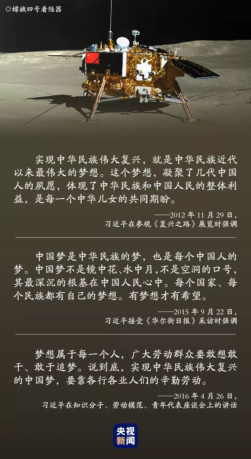 习近平总书记在讲话中指出,梦想是激发活力的源泉。中华民族是勇于追梦的民族。党中央决策实施探月工程,圆的就是中华民族自强不息的飞天揽月之梦。月球探测的每一个大胆设想、每一次成功实施,都是人类认识和利用星球能力的充分展示。在建成社会主义现代化强国、实现中华民族伟大复兴的征途上,每一个行业、每一个人都要心怀梦想、奋勇拼搏,一步一个脚印,一棒接着一棒,在奋力奔跑和接续奋斗中成就梦想。