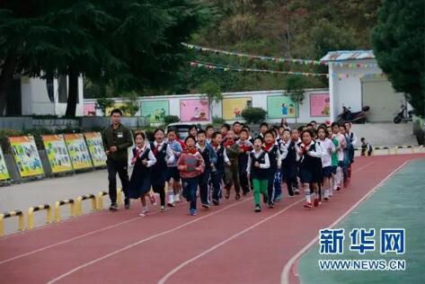拼版照片:上图为罗田县希望小学的资料照片;下图为10月11日清晨,罗田县希望小学学生在老师的带领下晨跑。