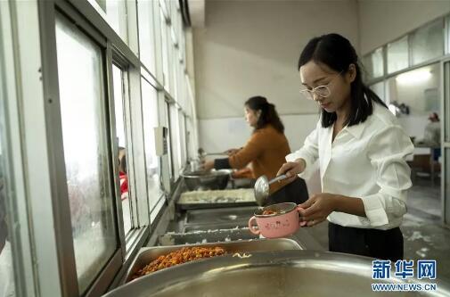 方荣在罗田县希望小学食堂给学生打饭(10月11日摄)。