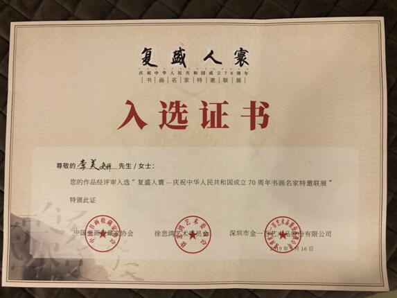 近日,中华人民共和国成立70周年---复盛人寰”书画名家特邀联展在深圳美术馆开幕。本次展览的展品既包括张大千、齐白石、黄宾虹、谢稚柳、于佑任、徐悲鸿等近代大师的典藏级书画珍品,也包括戴泽、范曾、孙其峰、霍春阳、苏士澍、徐庆平、尼玛泽仁等当代名家的全新力作,以及部分中青年书坛、画坛精英的精彩作品,其中包括青年书法家、画家李美妍的两件书法作品,这两幅展品也曾在香港图书馆“2018年度改革开放40周年---香港回归21周年---香港内地名家艺术展”隆重展出。