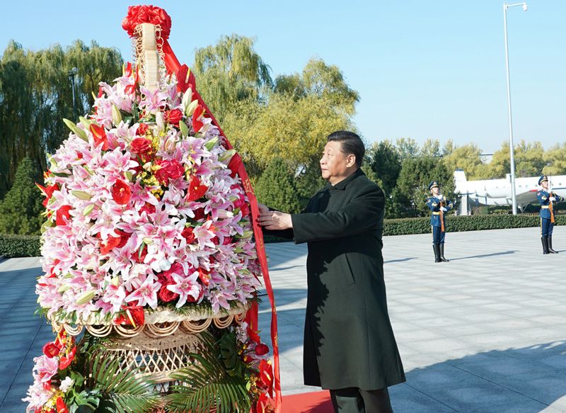 △11月8日,中共中央总书记、国家主席、中央军委主席习近平出席庆祝空军成立70周年主题活动,代表党中央和中央军委,对空军成立70周年表示热烈祝贺,向空军全体官兵致以诚挚问候。这是习近平来到位于北京市昌平区的中国航空博物馆,向人民空军英烈敬献花篮。
