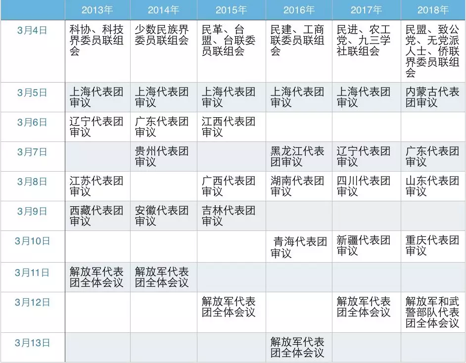 2013年看望科协、科技界委员,谈的是创新驱动发展战略;2014年看望少数民族界委员,谈民族大团结;2015年看望民革、台盟、台联委员,谈两岸关系;2016年看望民建、工商联界委员,谈非公有制经济发展;2017年看望民进、农工党、九三学社委员,谈对知识分子的尊重;2018看望民盟、致公党、无党派人士、侨联界委员,谈中国新型政党制度。