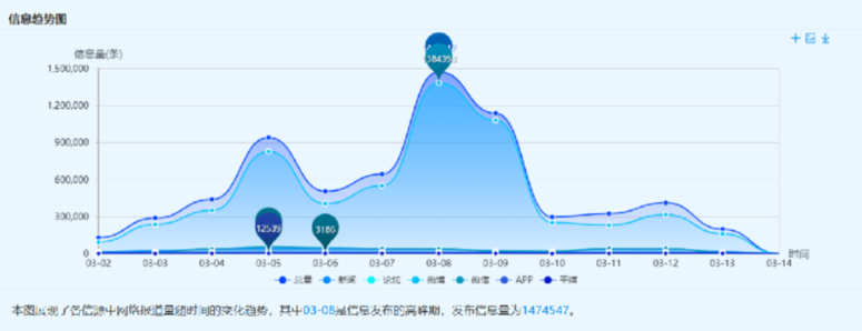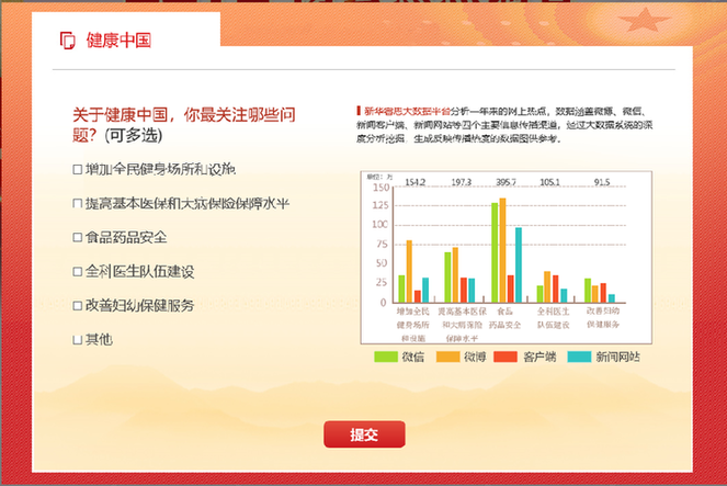 新华睿思大数据通过监测新闻网站、论坛、微信、微博、APP、平媒6个信源,分析结果显示,截至目前,全国两会开幕以来,关于健康中国的话题共6788791个。