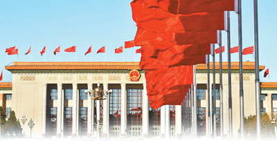 3月15日,人民大会堂外红旗招展。 本报记者 雷 声摄