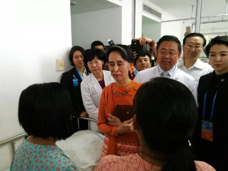 ▲2017年5月16日,缅甸国务资政昂山素季来到北京安贞医院看望受救助在京做手术的缅甸先心病患儿。她在北京出席首届“一带一路”国际合作高峰论坛。新华社记者李雪笛摄