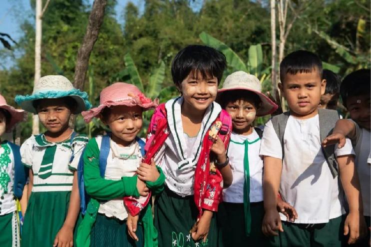 ▲这是1月13日在皎漂县中国援建学校拍摄的小学生。孩子们脸上涂着当地人常用的天然防晒护肤品“特纳卡”。新华社记者杜宇摄