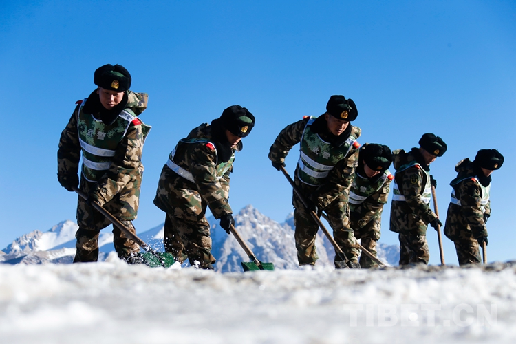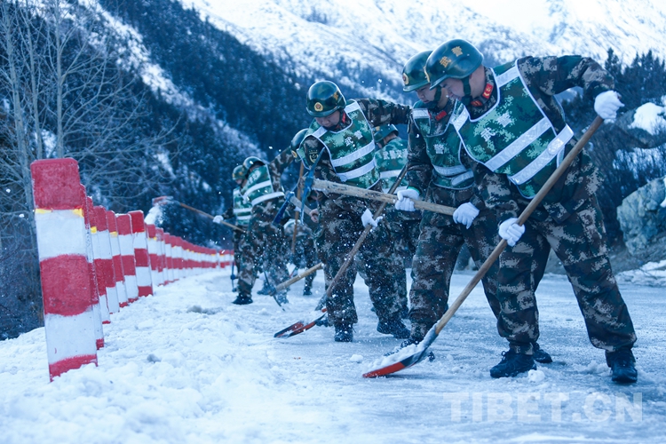 图为官兵在业拉山段清理路面积雪结冰