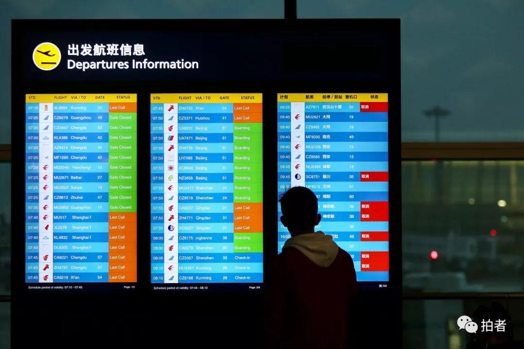 1月23日,武汉天河国际机场,大量航班被标红,显示取消。