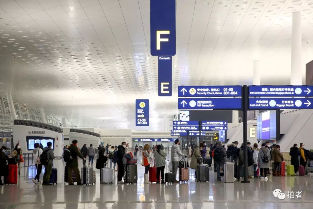 机场大厅已经挤满了想要出城的旅客。新京报记者看到,每个值机柜台前都站满了人,有的队伍排了近百米长。所有工作人员、乘客都戴好了口罩。