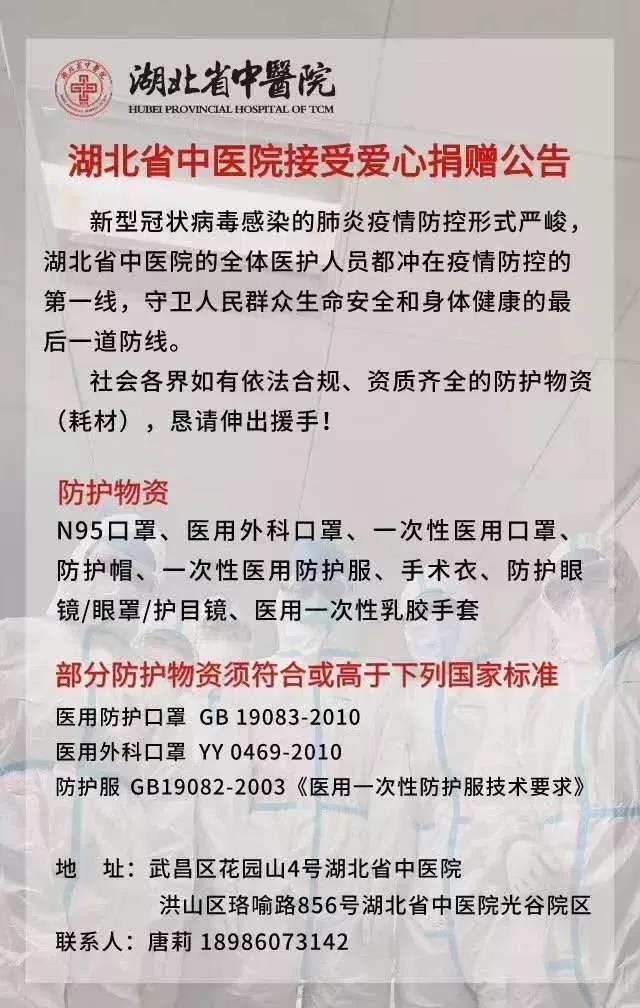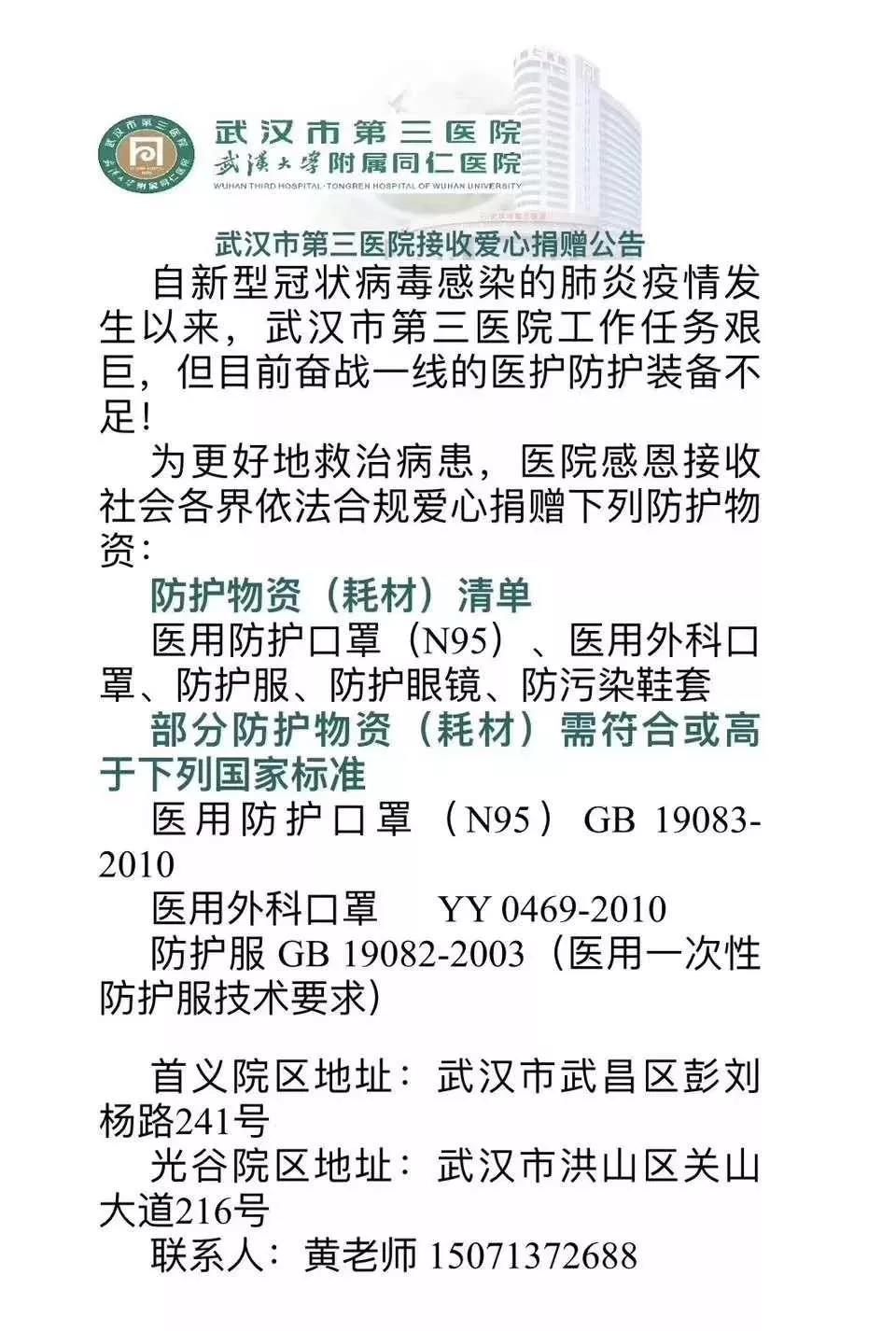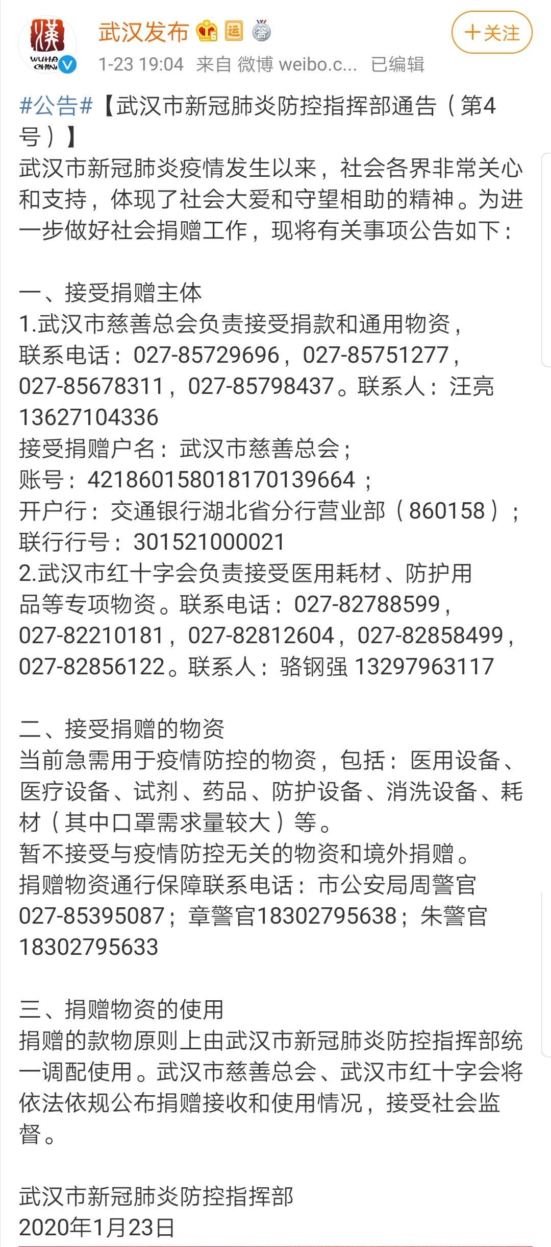 此前,武汉市新冠肺炎防控指挥部通告(第3号)开通24小时电话接收社会各界爱心捐赠。武汉市红十字会电话:027-82788599,027-82210181,027-82812604,027-82858499,027-82856122。联系人:骆钢强 13297963117。