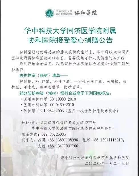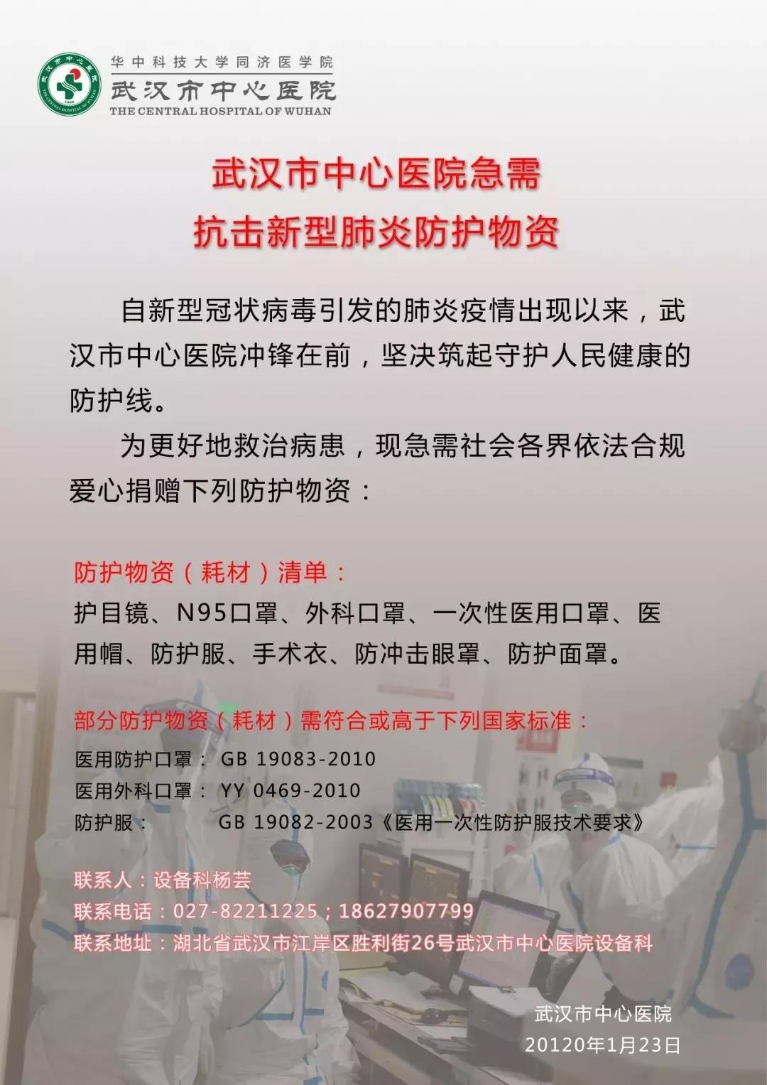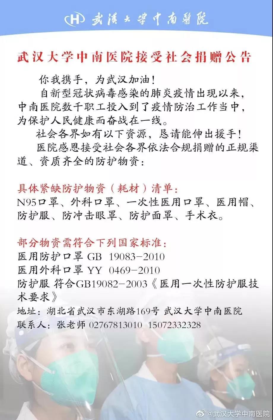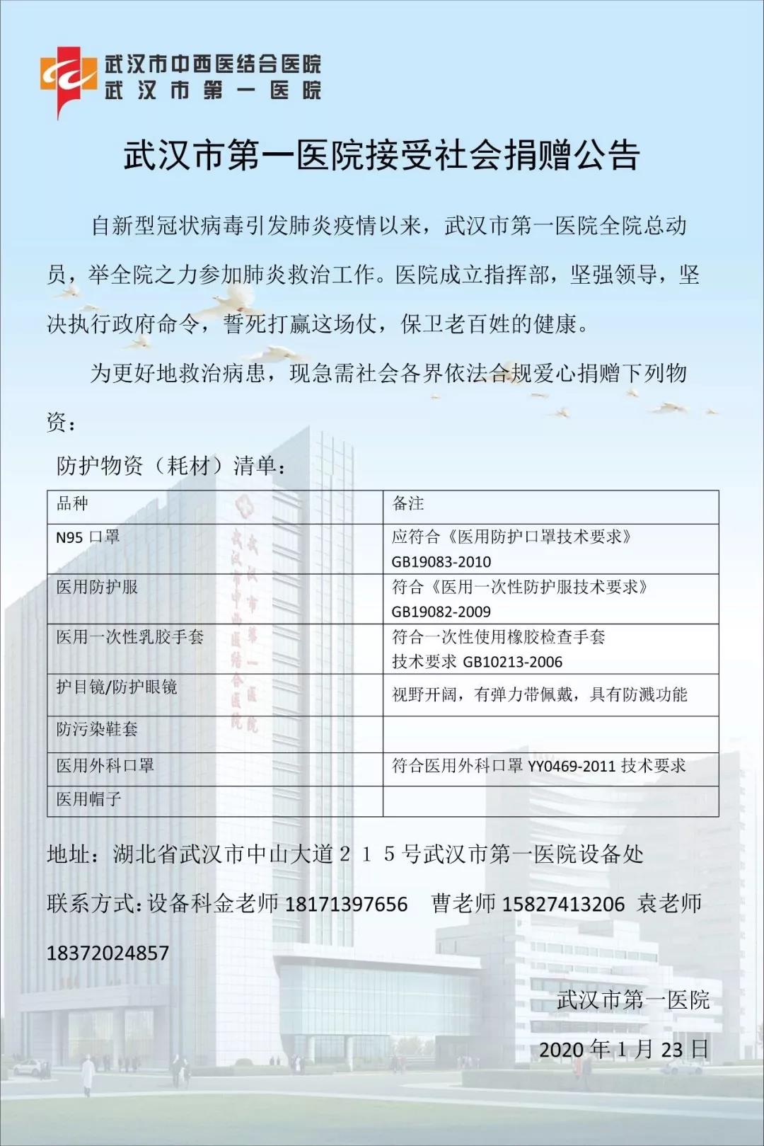 此前,武汉市新冠肺炎防控指挥部通告(第3号)开通24小时电话接收社会各界爱心捐赠。武汉市红十字会电话:027-82788599,027-82210181,027-82812604,027-82858499,027-82856122。联系人:骆钢强 13297963117。