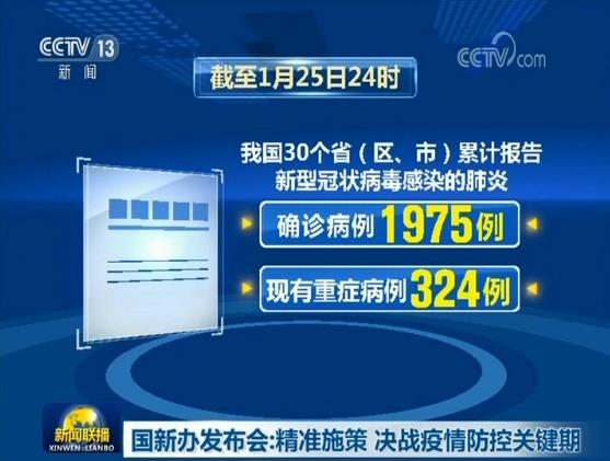 国家卫健委通报,截至1月25日24时,我国30个省(区、市)累计报告新型冠状病毒感染的肺炎确诊病例1975例,现有重症病例324例。累计死亡病例56例,累计治愈出院病例49例,现有疑似病例2684例。