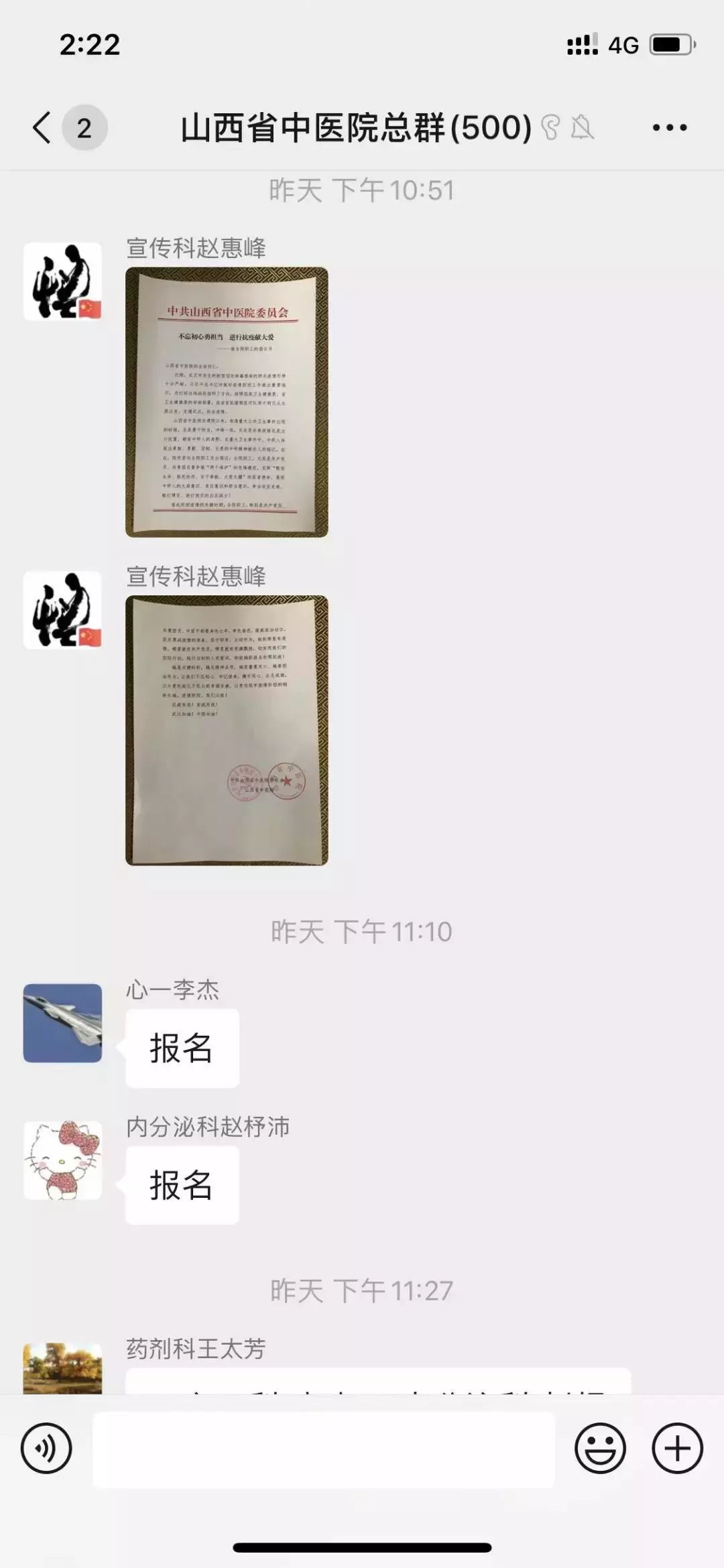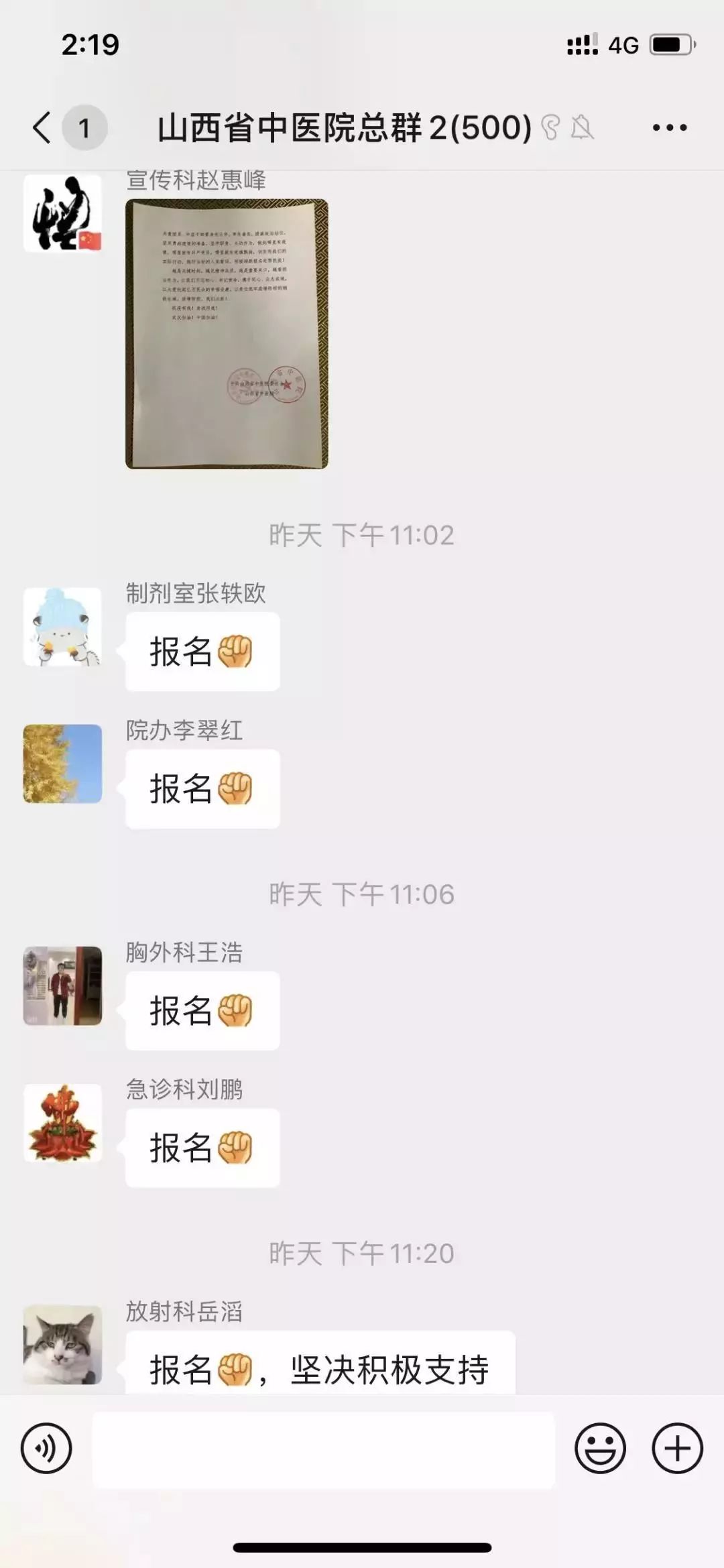 倡议书在医院群里一经发出,“时刻准备着,一切听从党的领导,听从组织安排”“我学公卫的,算我一个”“我学急诊的,算我一个”“已报名,随时听从组织安排!”医院群内积极报名的瞬间达到几百人。