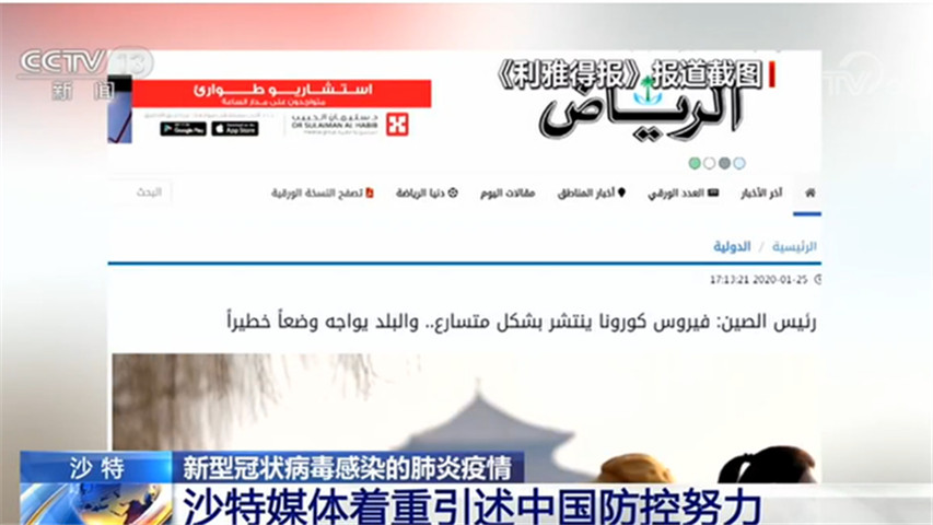 沙特国家电视台和国家通讯社等官方媒体均引用中央广播电视总台的报道,向本国观众介绍新型冠状病毒感染的肺炎疫情的相关情况,以及中国在防控疫情中采取的措施。沙特最大的阿拉伯语报纸《利雅得报》在报道中着重引述了中国在防控方面作出的努力,称在中国国家主席习近平的领导下,中国已采取措施防止疫情蔓延,并强调中国将指定医院的专家等资源集中用于治疗重症患者,不会因为费用等原因推迟治疗,并将保障湖北省省会武汉的物资供应。