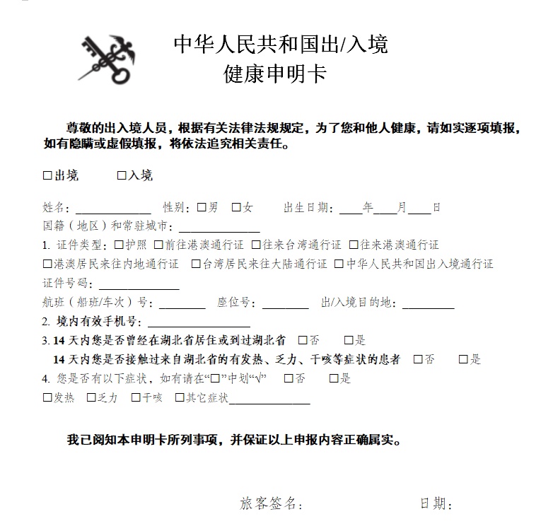 所有出入境人员在出、入境时可向口岸海关卫生检疫部门领取并如实填写《中华人民共和国出/入境健康申明卡》。