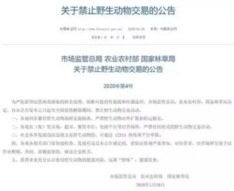 为此,国家市场监管总局、农业农村部、国家林业和草原局26日联合发布公告要求,即日起至全国疫情解除期间,禁止野生动物交易活动,以斩断病毒的传染源和传播途径。