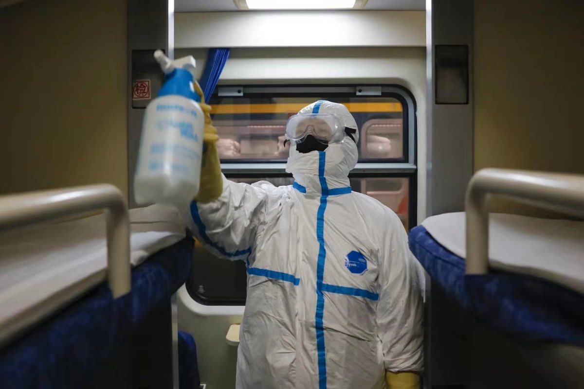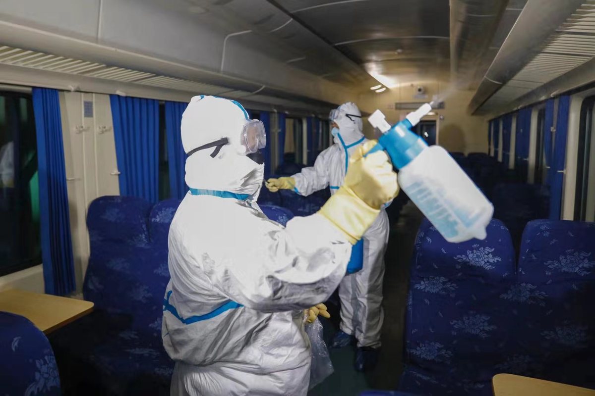 列车车厢里人员密集,流动性大,跨越地区多,容易滋生细菌。特别是近期疫情形势严峻,列车消毒增加了频次,现在工作量是以往的两倍以上。张强和搭档每天要工作近6个小时,对40多组列车消毒,常常要工作到夜里12点。