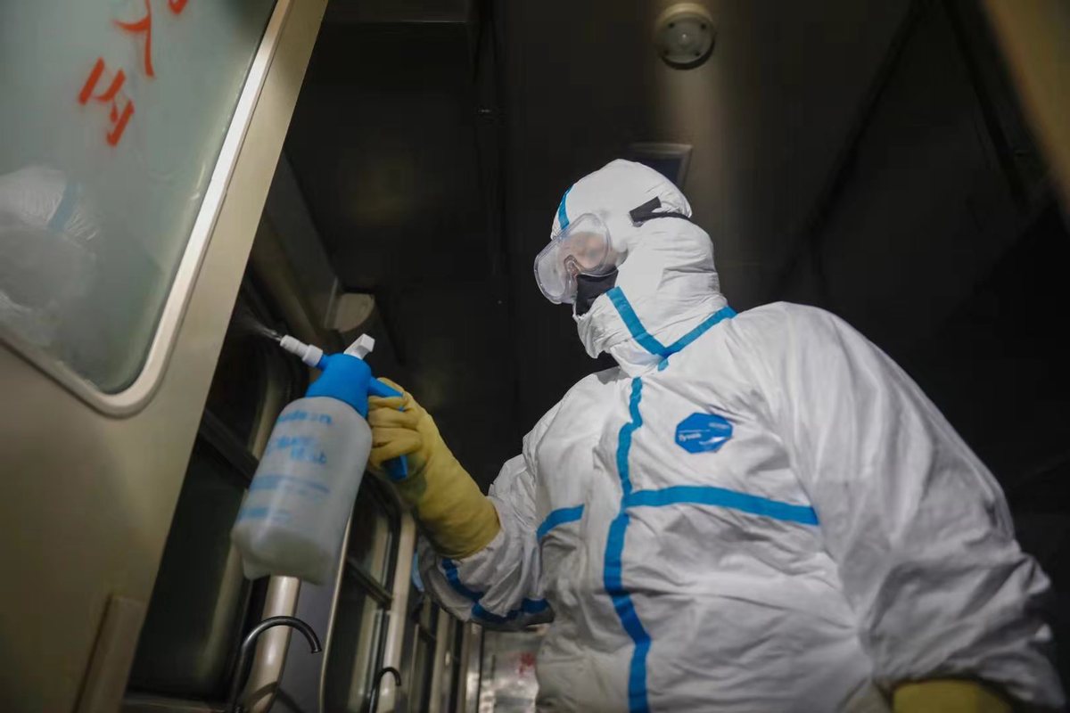 “我们调配使用的是含氯消毒液,能有效杀死冠状病毒,除了列车上的卫生间、洗面间、门把手等关键区域,还要对空气消毒,让消毒液附着在空气中的病毒上,达到消杀的目的。”张强精准地配比着消毒药剂,然后举着喷壶,对着空气喷洒了一圈。