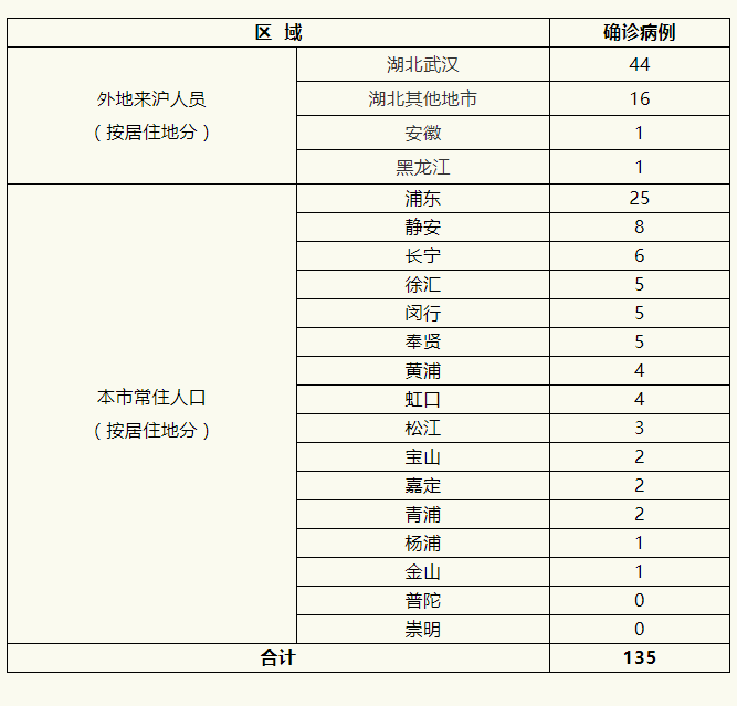 截至1月31日12时,上海市已累计排除疑似病例245例,发现确诊病例135例。确诊病例中,男性70例,女性65例;年龄最大88岁,最小7岁;89例有湖北居住或旅行史,2例有湖北以外省市居住或旅行史,42例有相关确诊病例接触史,2例无湖北接触史;外地来沪人员62例,本市常住人员73例。具体情况如下: