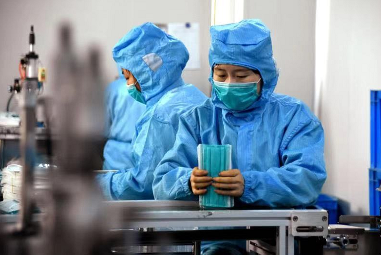 1月28日,工人在河北定州市一家口罩生产企业车间工作。连日来,河北省定州市口罩生产企业召回员工加班加点生产口罩,助力防控新型冠状病毒感染的肺炎疫情。