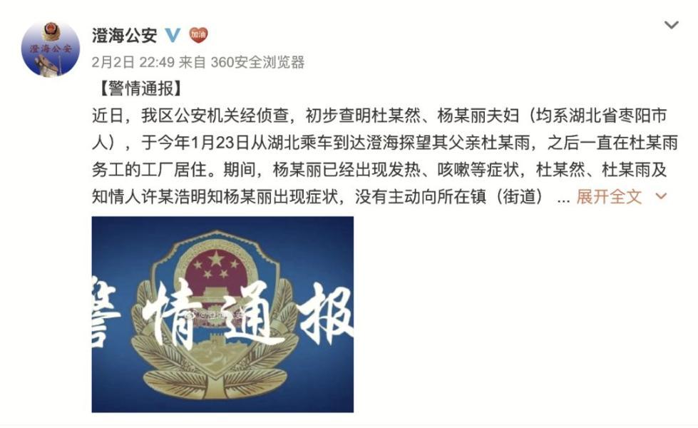 2月3日凌晨, 广东省汕头市公安局澄海分局发布警情通报。