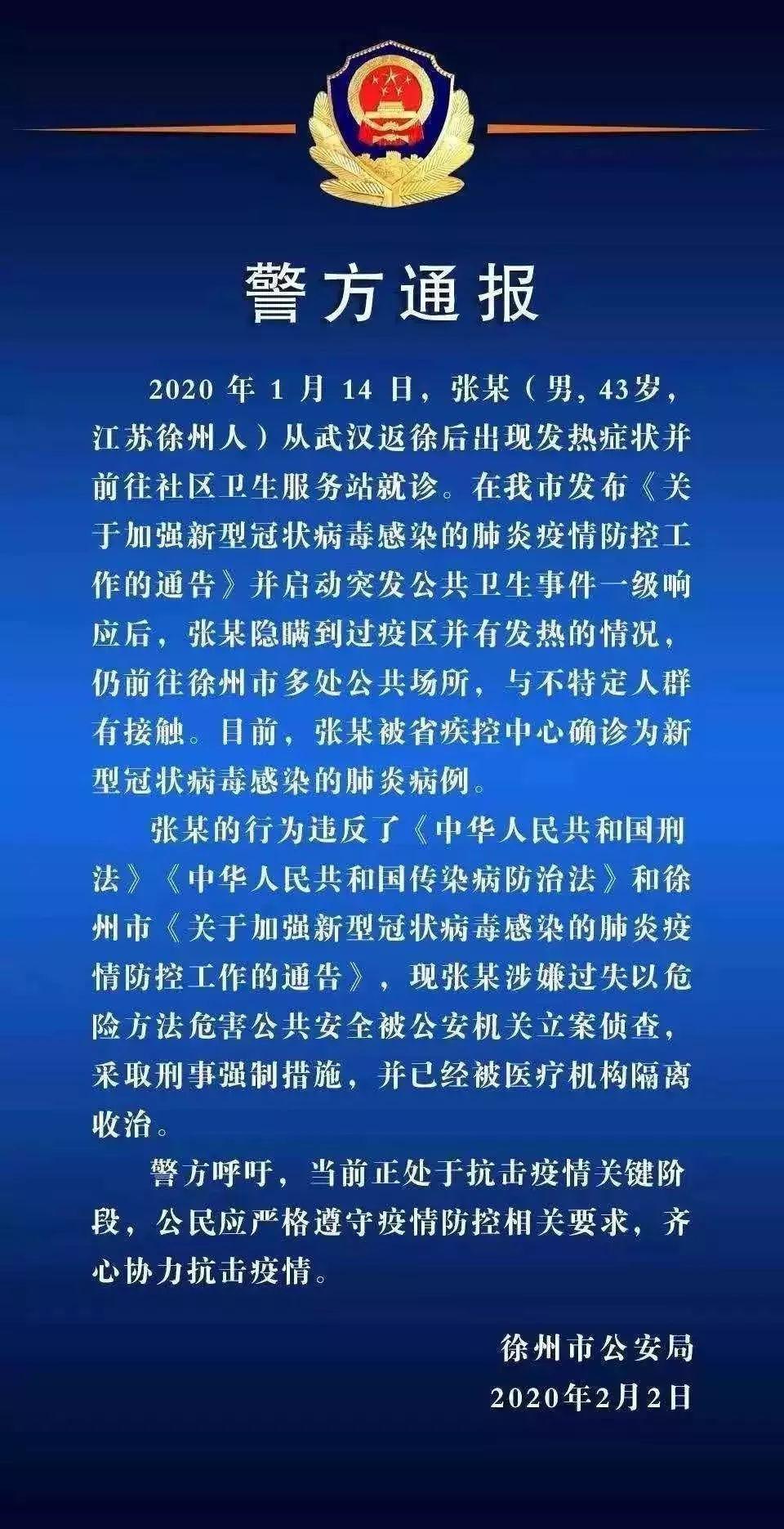 2日晚,徐州市公安局发布一则警方通报,针对一名武汉返徐人员,在身体出现发热症状后,明知徐州已发布疫情防控相关规定,在就诊时故意隐瞒病情及武汉旅居史,并到多处公共场所与不特定人群接触,该男子随后被确诊为新型冠状病毒感染的肺炎病例。