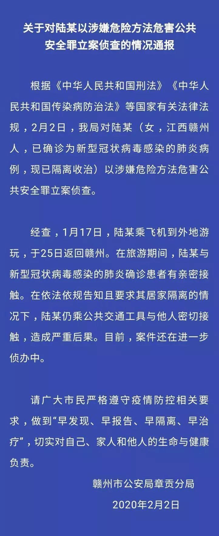 2日晚,江西赣州市公安局章贡分局通报,陆某(已确诊为新型冠状病毒感染的肺炎病例,现已隔离收治)居家隔离期间仍乘公共交通出行,被公安机关以涉嫌危险方法危害公共安全罪立案侦查。经查,1月17日,陆某乘飞机到外地游玩,于25日返回赣州。