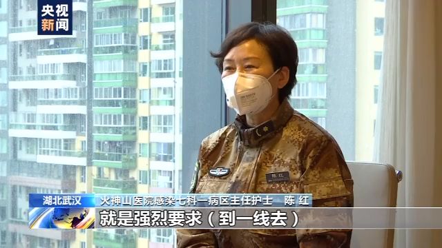 火神山医院感染七科一病区主任护士 陈红:非常主动要求的,就是强烈要求(到一线去),我对军队军人有一种特殊的情结。就是在这种困难的时候,有大灾大难的时候,我们军人就应该义无反顾去奔赴前线。