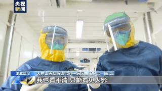 火神山医院感染七科一病区主任护士 陈红:你看我这全是哈气,我也看不清,只能看见人影,喘不上来气。我的汗都往下面流,像水一样。