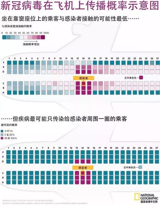 客舱空气在横断面上循环,飞沫的播散被限制在少数几排座位,对于其他乘客,被感染的危险并不显著。