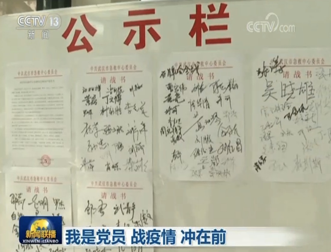 央视网消息(新闻联播):习近平总书记强调,各级党组织和广大党员干部必须牢记人民利益高于一切,不忘初心、牢记使命,团结带领广大人民群众坚决打赢疫情防控阻击战。一个党员就是一面旗帜,在武汉抗击疫情的主战场上, 党员医务工作者主动请缨,冲锋在最前线的身影里,总能看到一位位共产党员当先锋、做表率。