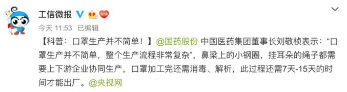 其实,口罩生产并不简单!中国医药集团董事长刘敬桢表示:“整个生产流程非常复杂”,鼻梁上的小钢圈,挂耳朵的绳子都需要上下游企业协同生产,口罩加工完还需消毒、解析,此过程还需7天-15天的时间才能出厂。