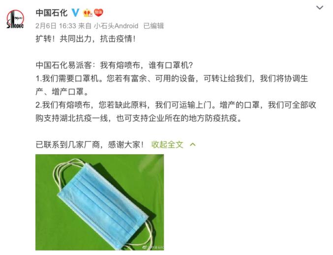 2月6日下午,中国石化官方微博发布消息,中国石化易派客(中国石化旗下电子商务网站)正寻找口罩机:我有熔喷布,谁有口罩机?