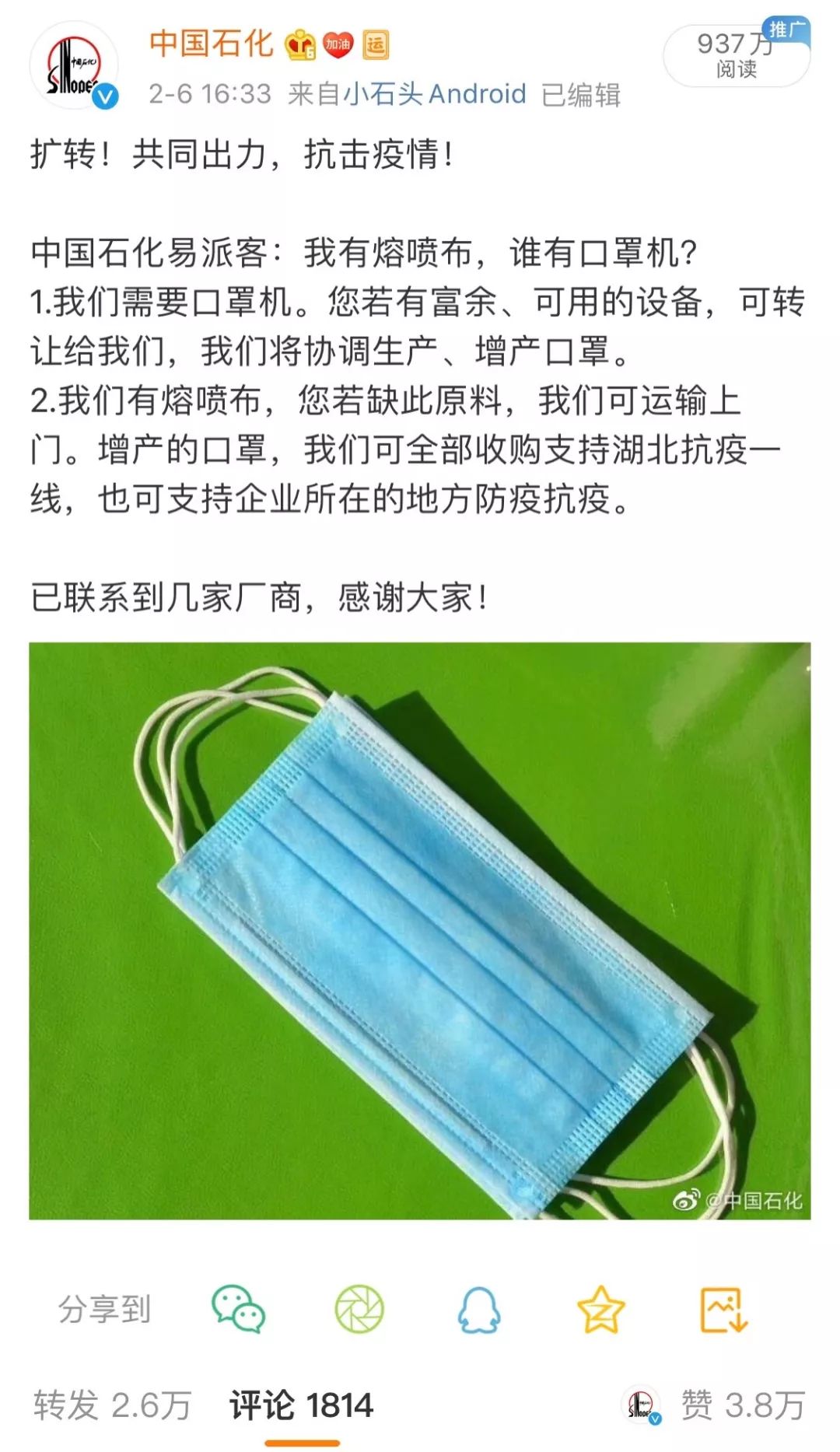 2月6日,中国石化官方微博发布消息:《我有熔喷布,谁有口罩机》。