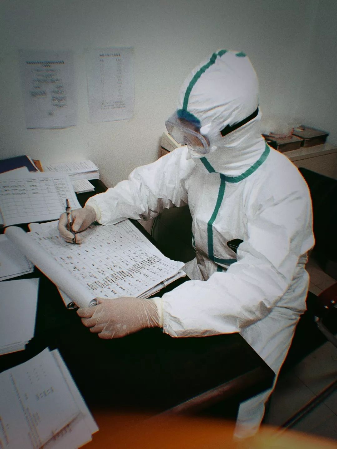 凌晨一点半,流调室,主动请缨到西安咸阳国际机场口岸一线支援的关中海关查检三科科长张毅,是卫生检疫的专业人员。此刻,他套在笨重闷热的防护服里,正在对有发热症状的旅客进行流调排查。绝不能让疫情从机场口岸蔓延,是他的使命,也是他的承诺。一个夜班,14个小时,晚八点到早十点。一次询问,至少半小时,航班多的时候,一口气询问8、9个旅客不休息。费力的脱下防护服那一刻,脸上满是印痕,衣服早已湿透。