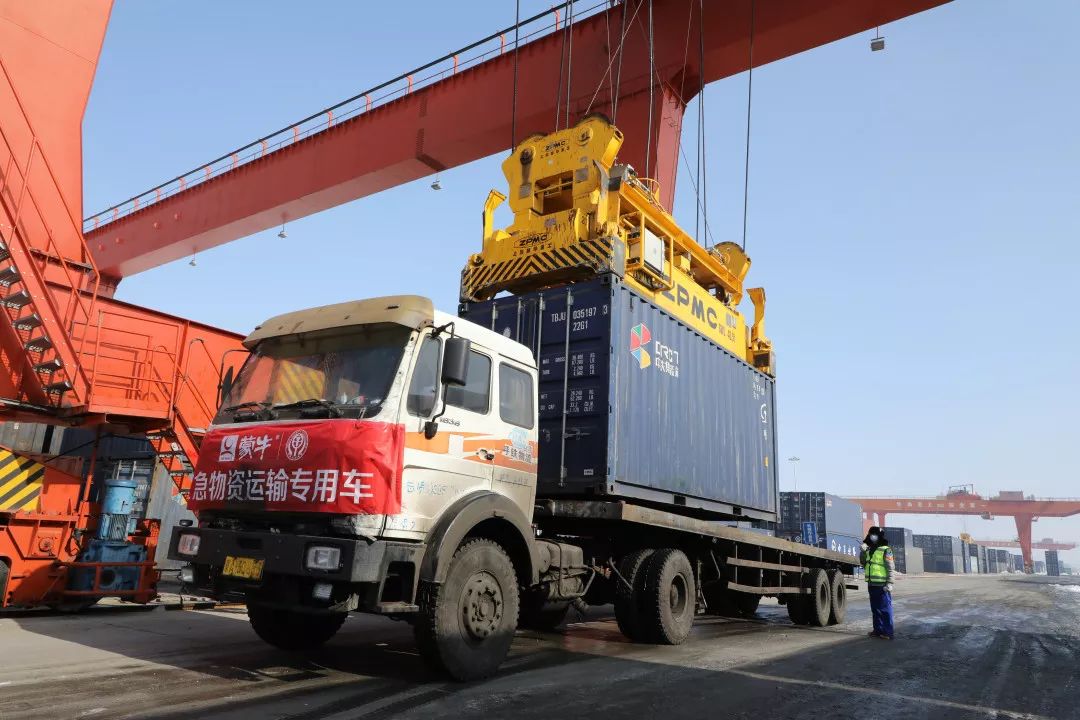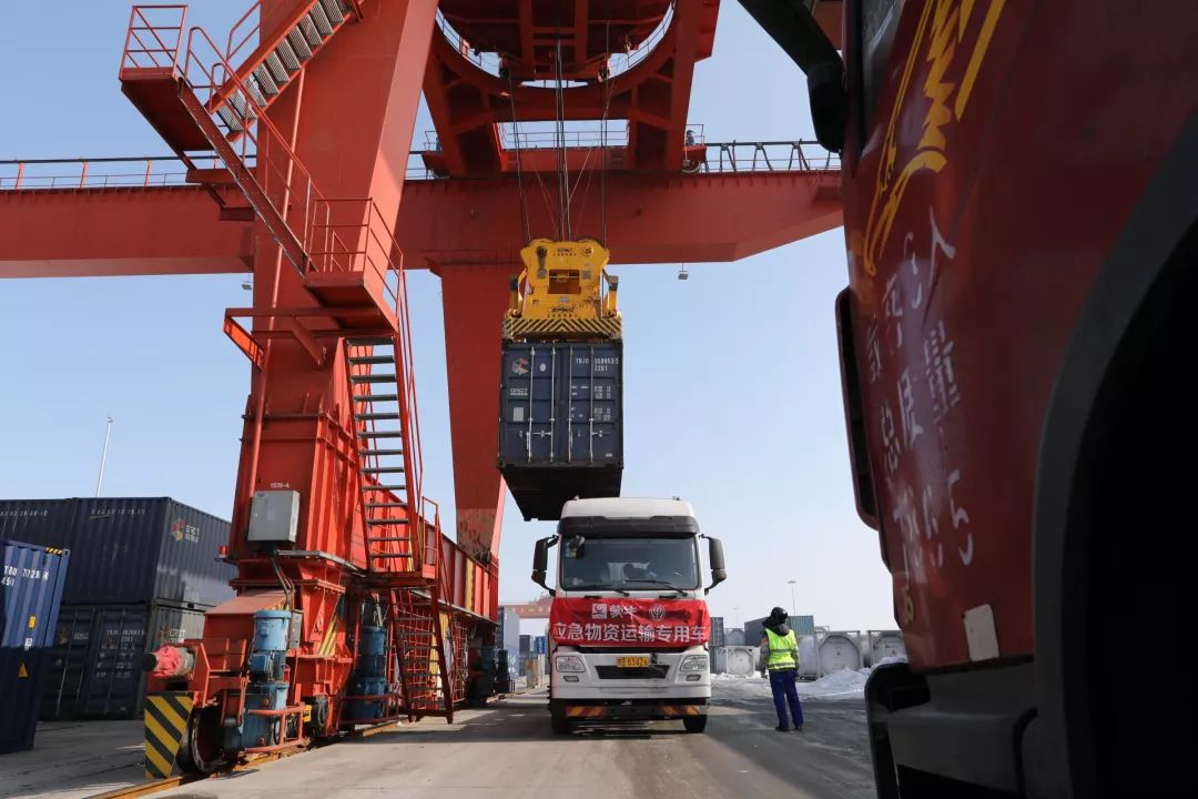 2月7日,内蒙古自治区内企业与中华慈善总会筹集的应急物资,在中国铁路呼和浩特局集团有限公司沙良物流园内集散分流,通过铁路网发往武汉。