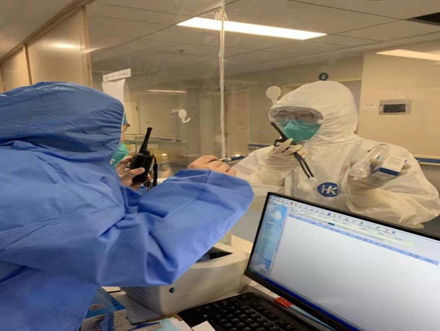 在这里,医护人员有分工,但更多的是相互协作。医生看见护士忙,会帮着采集动脉血做血气分析,一起帮忙给病人翻身拍背,给病人喂食。同事之间也会相互关注防护服有没有穿戴好,有没有吃饭等等。五楼监护室的尚主任说,只要大家团结一心,艰难一定会过去,我们一定会打赢这场仗!