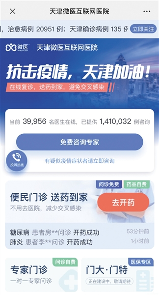 除针对新冠肺炎的免费义诊之外,围绕慢性病和常见病的便民门诊、心理援助专区和医护人员心理关怀通道也快速开通,天津微医互联网医院率先成为天津抗击疫情的“第二战场”。