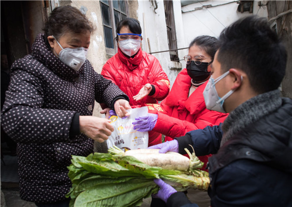 武汉市西城壕社区网格员黄丽芳(左二)与志愿者柳莹(右二)、张琦(右一)为空巢老人送菜(2月7日摄)。新华社记者肖艺九摄