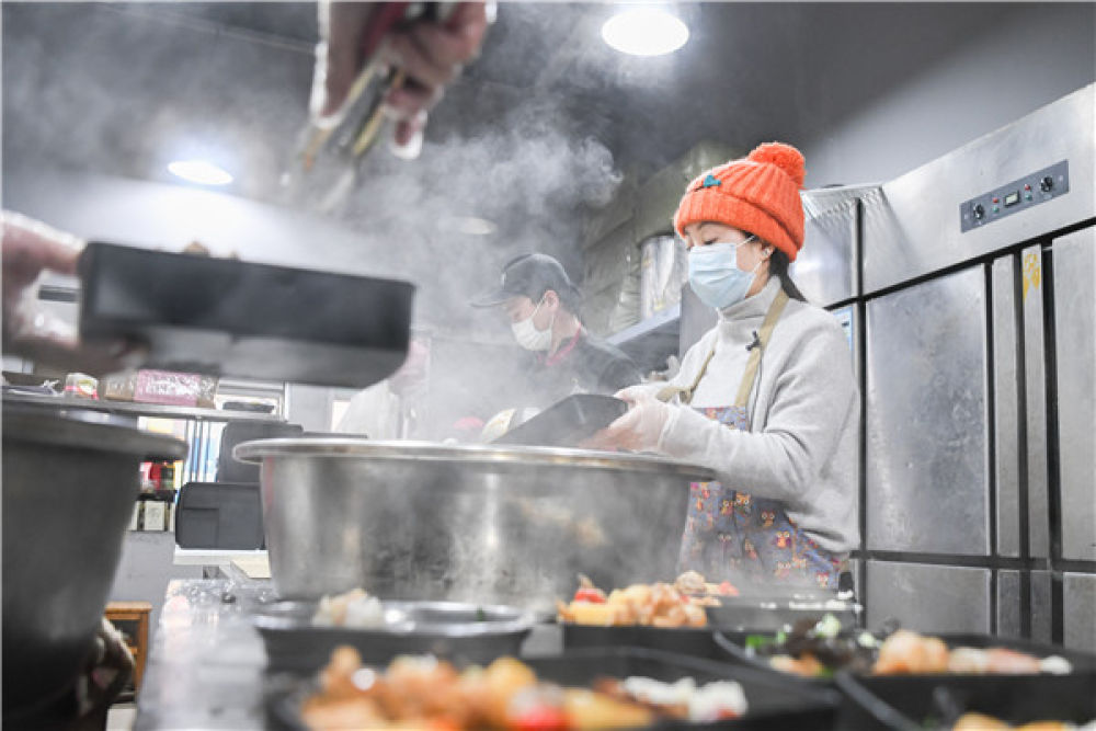 “雨衣妹妹”刘女士在位于武汉光谷青年城的餐饮门店厨房里分装盒饭(2月26日摄)。新华社记者 程敏 摄