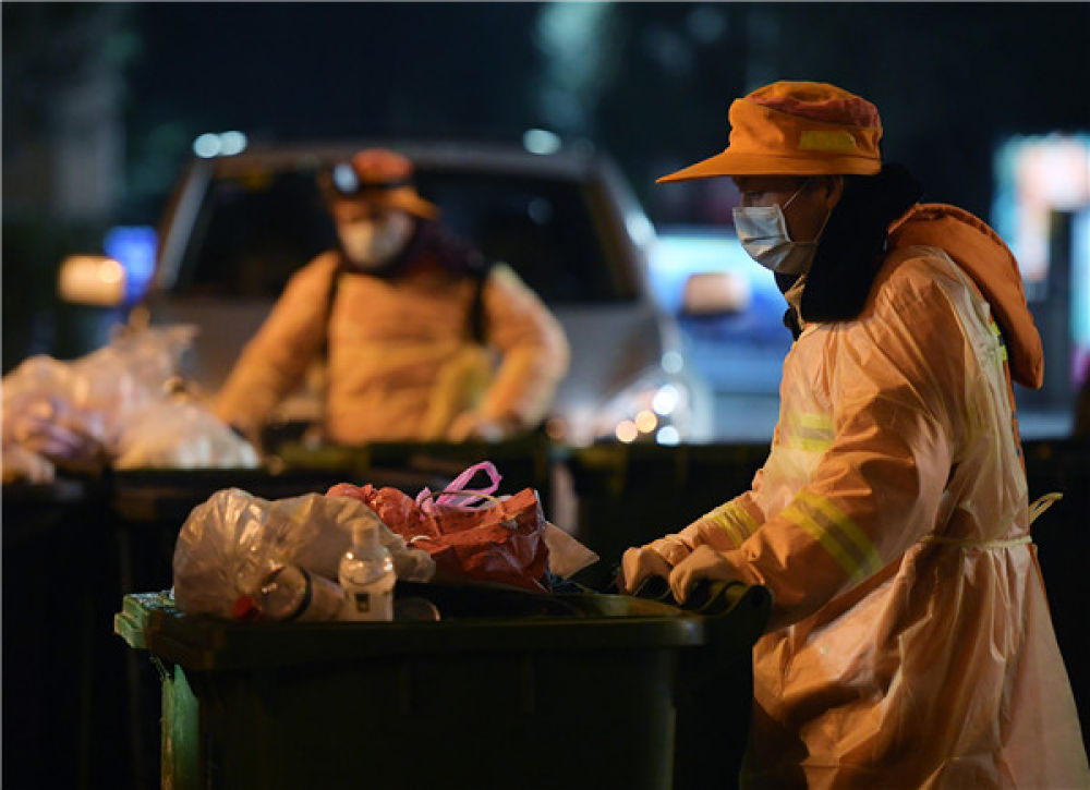 江岸环卫集团工作人员在武汉街头清运社区生活垃圾(2月1日摄)。新华社记者 李贺 摄